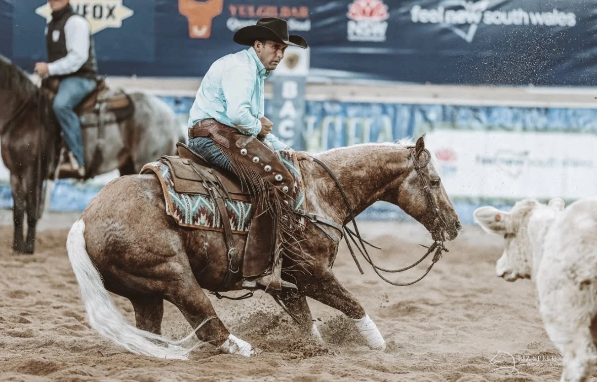 Sponsored rider of Two Bob Saddlery, Jackson Gray, riding in a custom cutter
